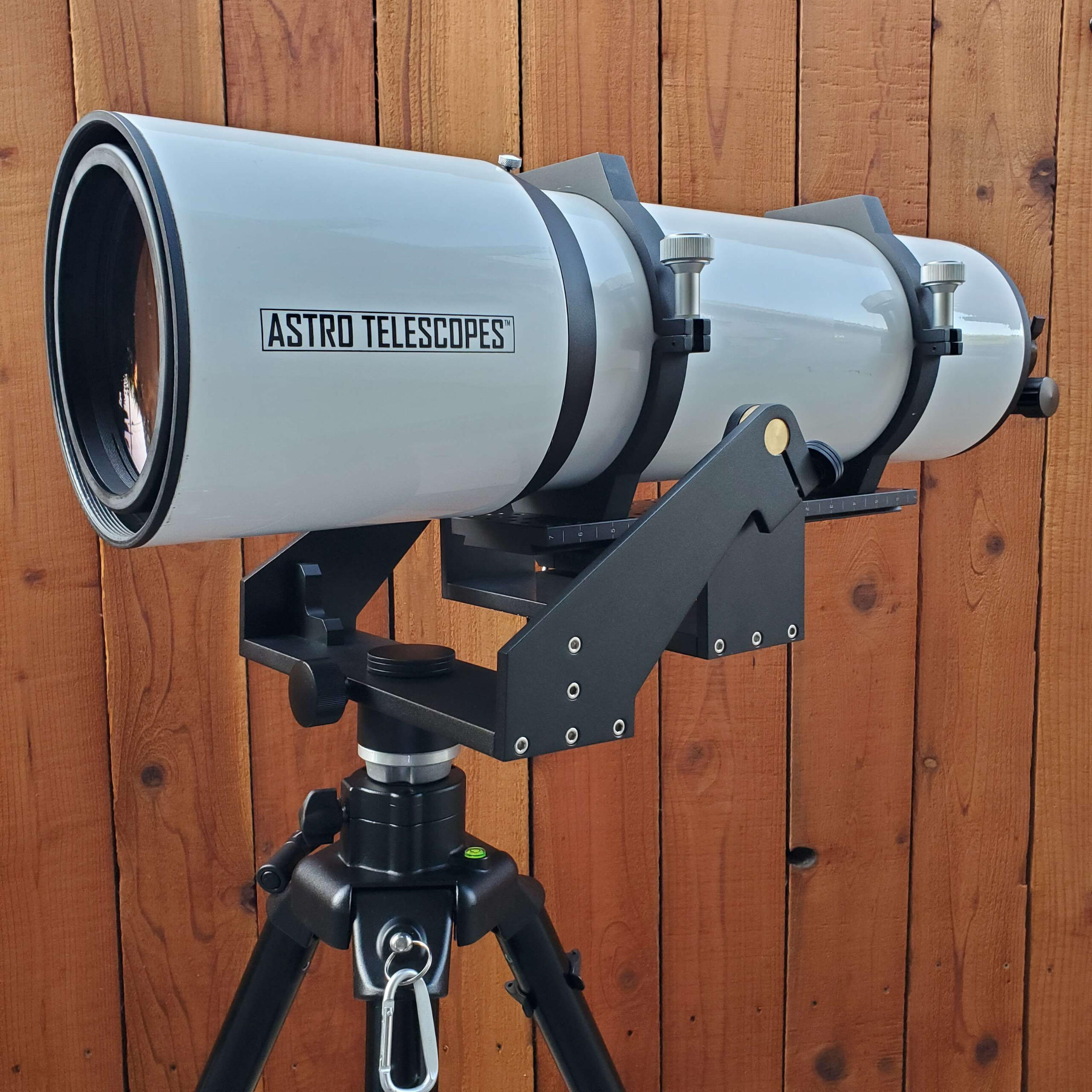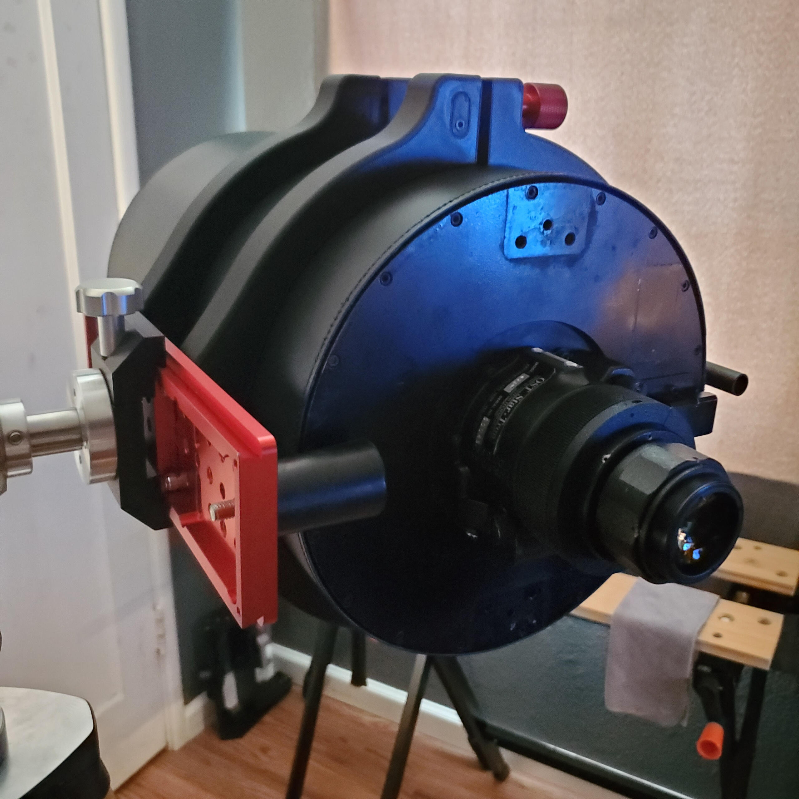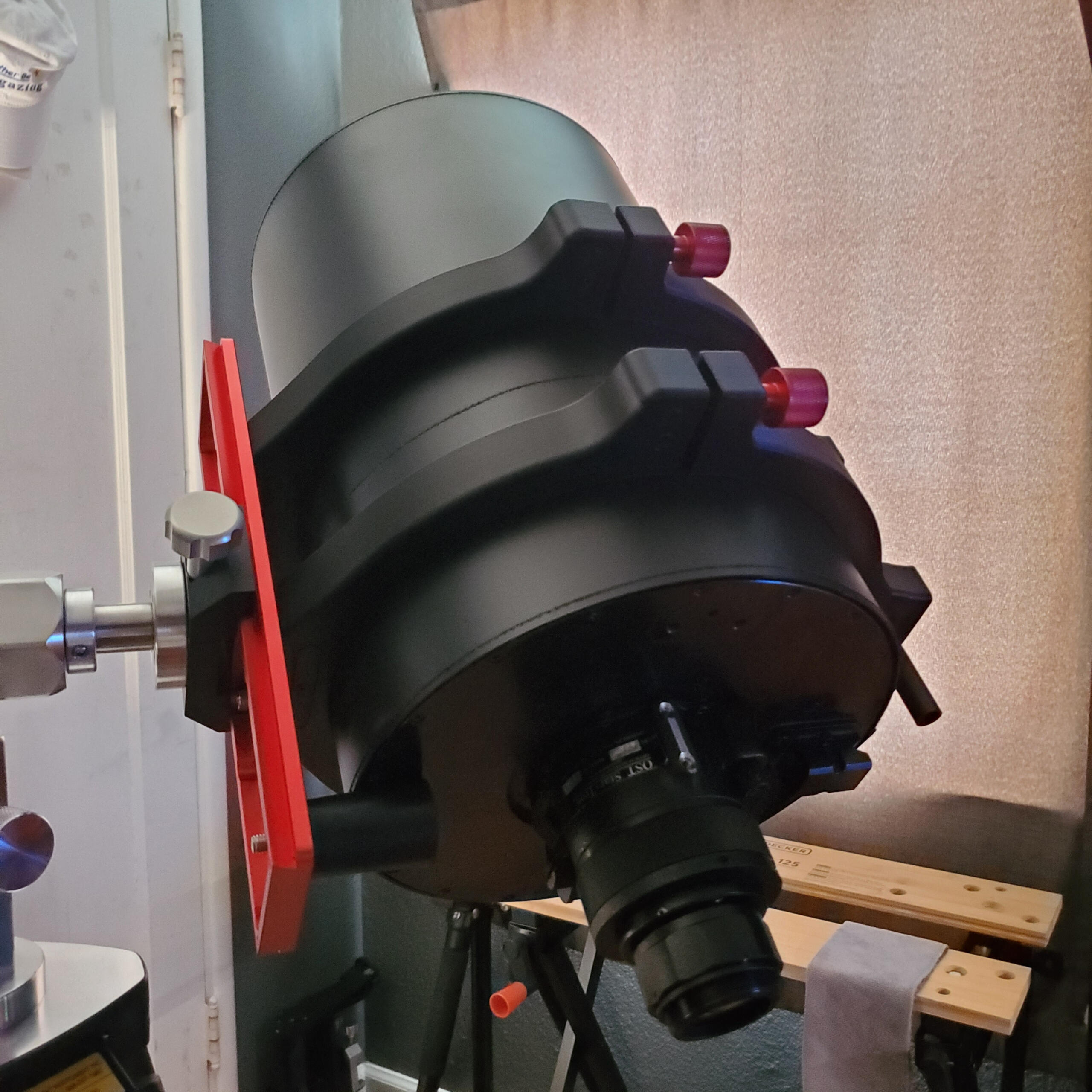 After the dreaded hassle of cleaning the threading, the mirror cell can finally be rotated and slowly moved back and forth, shifting focus.I purchased custom fitted rings from Rouz Astro. They’re 3D printed and I highly recommend Rouz for any of your ring needs. They’re fantastic and can hold dozens of pounds. Some back and forth emails between Rouz and myself, I had a beautiful pair of rings and a Losmandy plate.I wrapped the lens assembly in a dew shield I found on Amazon, a rubber furniture foot to prevent the lens from slipping backwards, and a screw I placed at the bottom of the Losmandy plate to prevent slippage from the saddle.Finally, the project was complete.