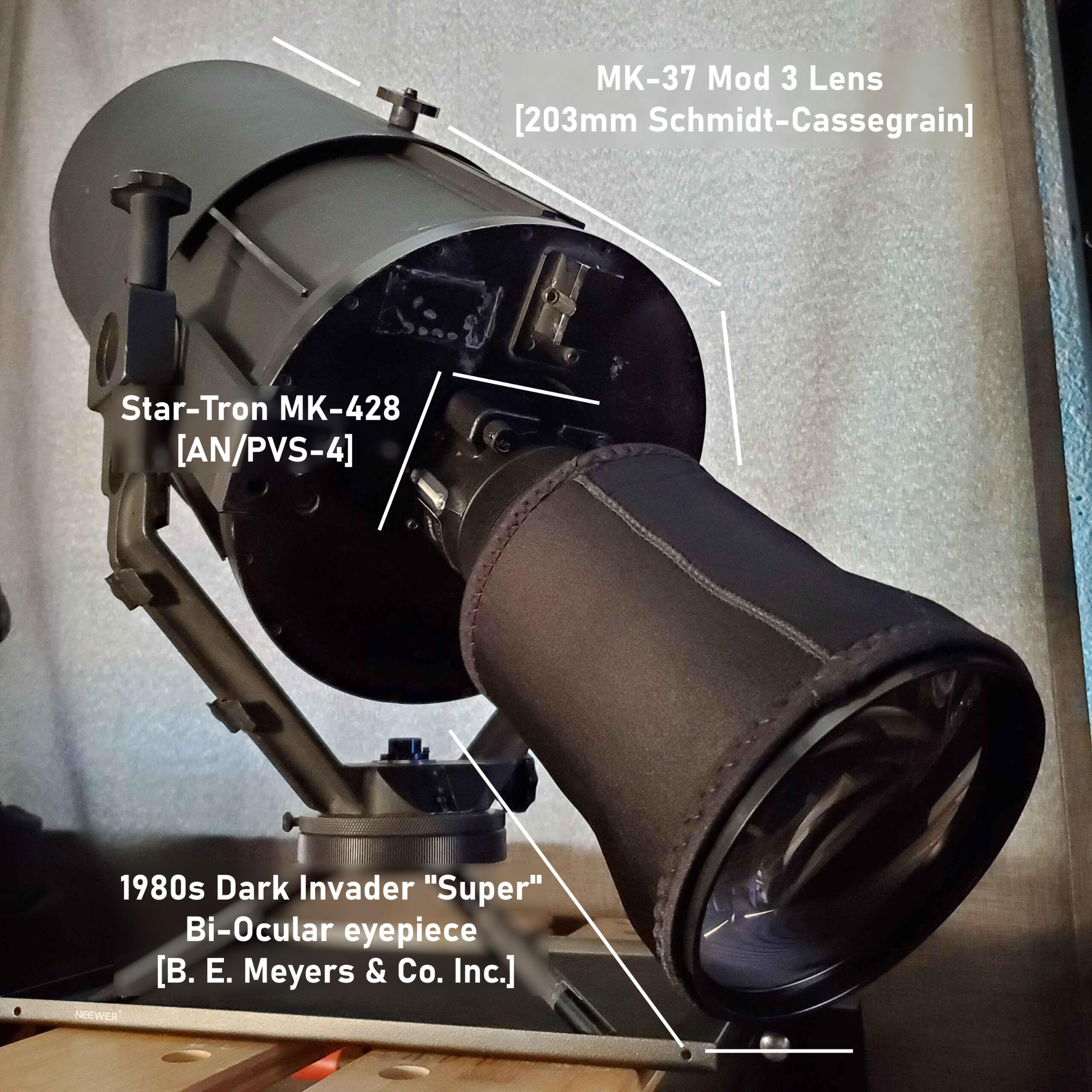 My primary NVD is an AN/PVS-4 — a Star-Tron MK428/LR170.This is a scope utilizing either a 25mm Gen 2 MX-9644/UV tube or a 25mm Gen 3 MX-11620/UV tube. The lens is a 170mm f/1.5 Catadioptric (magnification 6.8x).I purchased this used unit on eBay one night after watching a video by Carpe Nocturnum (@cnoct) on YouTube demonstrating various NVD on the night sky.Pictured left is my Star-Tron unit with a large bi-ocular eyepiece,