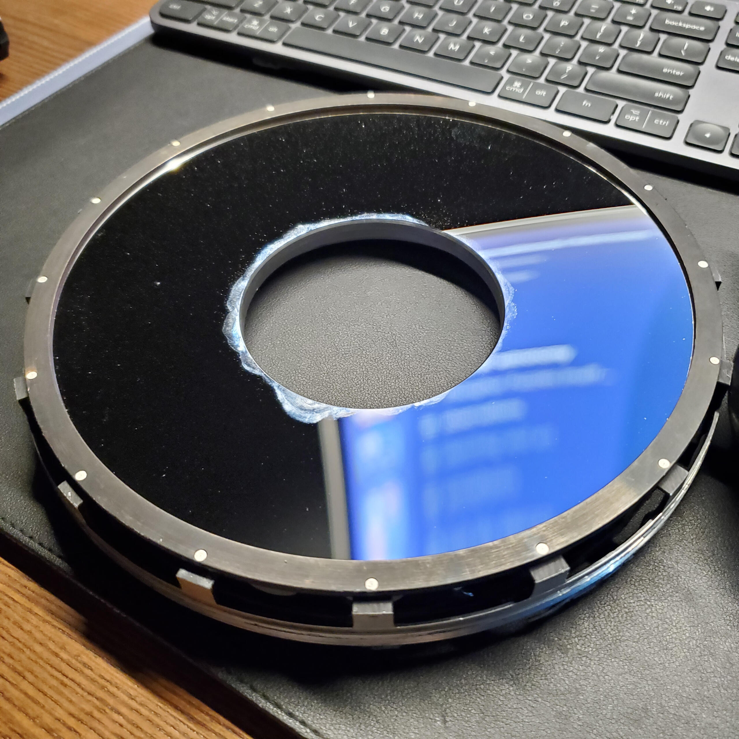 During the first light, stars were out of focus. It was clear this lens assembly was used primarily to observe objects only a few hundred yards away and not focused at infinity. Dread set in on needing to focus the mirror cell, which was a chore alone.Luckily I didn’t go down this route alone. CloudyNight forums reported users trying to use this lens assembly to stargaze but with no luck. It seems the hassle of having to focus the mirror cell was more than enough to ward off anybody, but I was set on doing so.30 individual screws had to be removed and organized. Two heavy plates, one to hold the housing of the NVD and the other covering the mirror cell, had to be removed.Finally, the mirror cell was exposed. It seemed molten rubber held the mirror in place from shifting during transit, which had to be scraped off and cleaned. Removing the mirror was a hassle as well, causing some fingerprints to be placed along the center (this was cleaned off shortly afterwards).