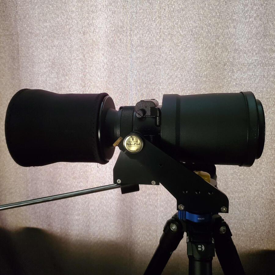 This was a recent delivery [Aug. 5, 2024] of a 203mm F/1.6 Schmidt-Cassegrain lens that I purchased for $225 on Ebay. It has yet to be reconfigured for astronomy use.However, I intend to keep it in its original form. There will be no disassembly of the fork mount for rings and a plate. I intend to keep it solely on it’s tripod as shown.In its current state shown below: a Star-Tron MK-428 [AN/PVS-4] configured on a MK-37 Mod 3 [203mm Schmidt-Cassegrain] lens with a 1980s Dark Invader "Super" Bi-Ocular eyepiece [B. E. Meyers & Co. Inc.].