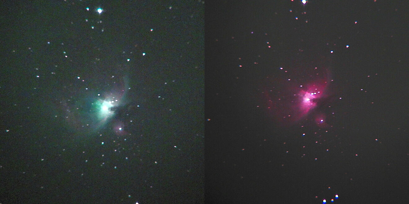 A comparison photo of the Orion Nebula during the late fall months. You can easily notice the complex structure of the stellar cloud.On the left side of the image is the Orion Nebula with my Sionyx Aurora Pro night vision camera, paired with a Lumicon UHC filter. On the right side is without.