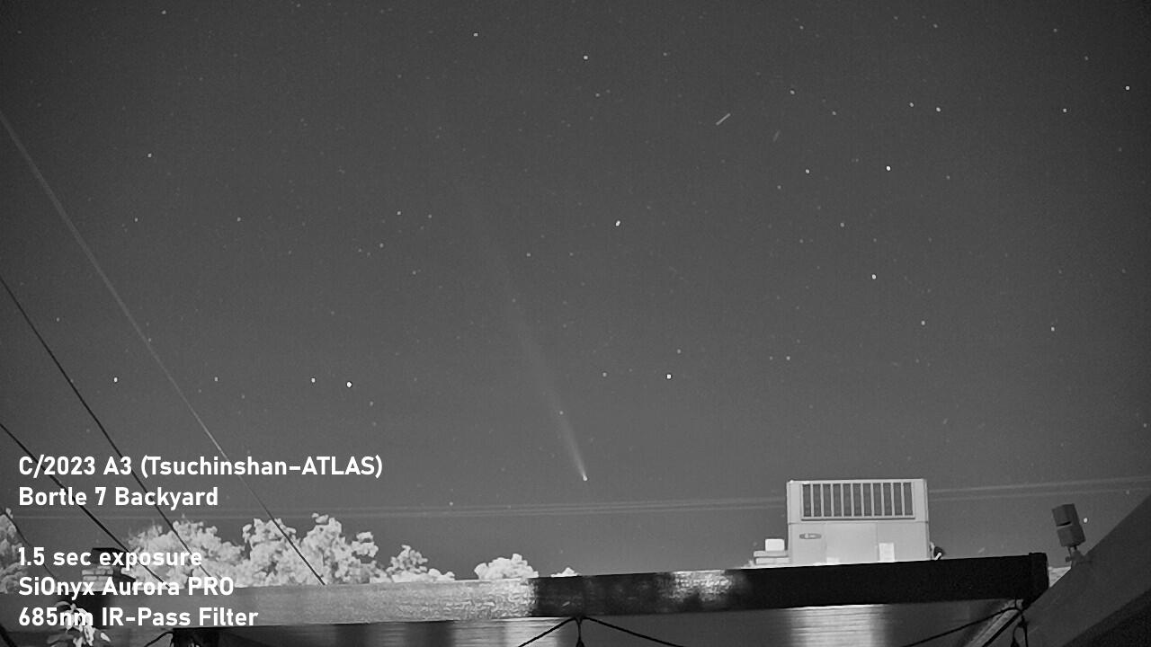 Comet C/2023 A3 (Tsuchinshan–ATLAS) from my backyard.Captured with my Sionyx Aurora Pro night vision camera, paired with a Baader 685nm IR-Pass filter.