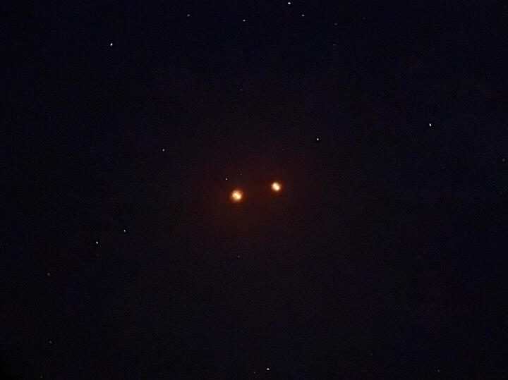 Those are Starlink satellites, they provide internet around the world courtesy of SpaceX. They're usually launched from the same rocket in batches, showing up in "trains" (long rows) as they slowly spread apart. They're brilliantly illuminated due to how high they are, thus being exposed to more sunlight and reflecting it down below to us observers.One night, my mother called me outside in a haste due to seeing a pair of glowing orange orbs silently floating in the night sky. As I rushed outside, she pointed them out in confusion. Without a second to spare, I immediately stated they were Chinese lanterns due to a nearby festival occurring. With good eyes, you can identify the small flickering of the lit candle inside.