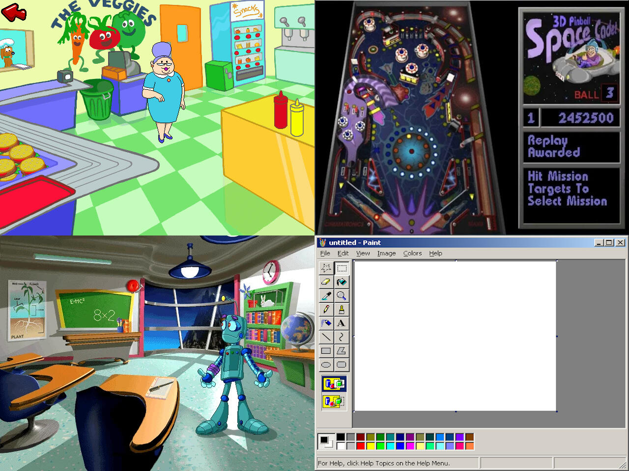 Recognize any of the PC games here? These were the first PC programs I played a lot since I was a kid growing up with a dinosaur desktop in a closet.Left to right, top to bottom:JumpStart 1st Grade (1995), Full Tilt! Pinball (1995), JumpStart Adventures 3rd Grade: Mystery Mountain (1996) and Microsoft Paint (1985).
